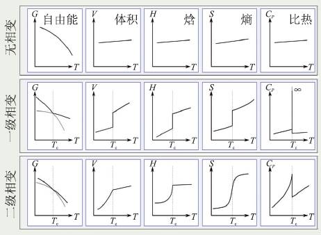 图4 热力学相变中各个物理量的变化行为(来自英文维基百科)