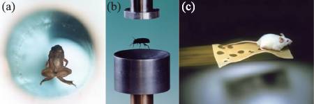 图4 (a)青蛙磁悬浮;(b)昆虫超声悬浮;(c)“飞毯”上的白鼠(来自英文维基百科及西北工业大学谢文军教授)