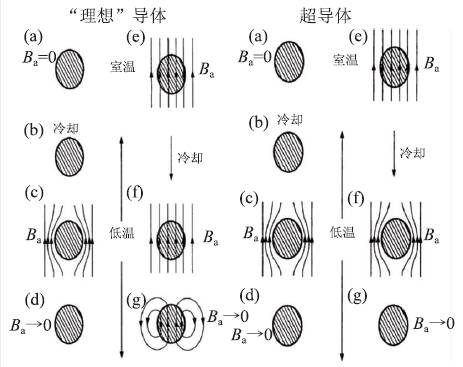 图9 “理想”导体与超导体的磁性的区别(来自张裕恒《超导物理》)