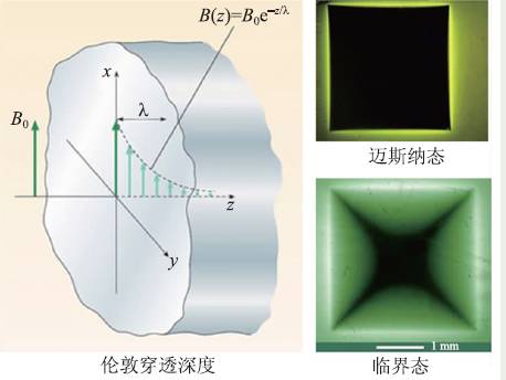 不过话说回来,“天下武功、无坚不摧”,再结实的瓷器,也顶不住金刚钻。超导体对磁场并非是百分百“免疫”的,即使在迈斯纳态,磁场也可以穿透到进入超导体表面和边缘处。随着外磁场强度的增加,磁场穿透的深度也会越来越大,最终夺占整个超导体,超导性能完全消失。这一现象于1935 年由伦敦兄弟提出,因为超导体内部磁感应强度为零,对麦克斯韦方程组稍加修改就可以得到新的描述超导电磁特性的方程,称之为“伦敦方程”[14]。由伦敦方程可知,磁感应强度在进入超导体之后指数衰减,其穿透深度又称为“伦敦穿透深度”,至今仍是描述超导材料的一个重要物理参数。完全破掉超导体的“金钟罩、铁布衫”,只需要足够强的磁场,就能让其抵达临界态,最终完全崩溃成有电阻的正常态(图10)[15]。