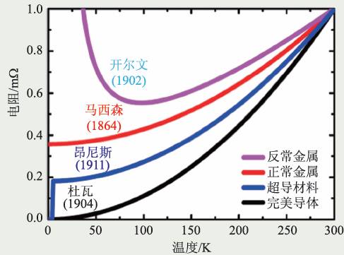 20 世纪初,经过百余年的电磁学研究,人们已经非常清楚地认识到金属材料的电阻随温度下降将会减小。理由很简单:给材料整体降降温,让原子们冷静冷静,这样电子在不太变幻的“八卦阵”里也许就可以迅速找到高速通道,尽量不损失能量全身而退[2]。理想看似丰满,现实却总是比较骨感。不同的人看问题的角度不同,于是在预测更低温度下金属电阻的走向时,有了多种不同的观点。大家普遍知道,金属中电阻主要来源于两部分,原子实热振动对电子的散射和杂质/缺陷等对电子的散射。降温只是让原子振动变弱,但无法改变杂质/缺陷的存在。因此, 1864 年,Matthiessen(马西森)预言金属电阻随温度下降到一定程度之后,将保持不变,即存在一个有限大小的“剩余电阻”[3]。开尔文勋爵不太同意这个观点,他认为在足够低的温度下,电流中的电子也有可能被“冻住”而不能前进,导致金属的电阻会迅速增加。我们在此姑且定义马西森预言的材料叫“正常金属”,而开尔文预言的叫“反常金属”。低温物理的先驱杜瓦和昂尼斯则有另一种观点,金属的电阻随温度下降会持续稳定地减小,最终在零温极限下变成零,成为一个没有电阻的“完美导体”(图2)[4]。