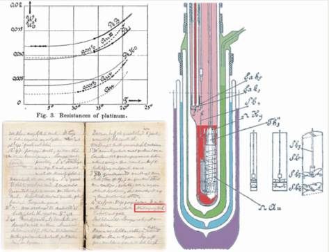 图4 昂尼斯的实验装置与实验笔记,图中红框即荷兰语“金属汞电阻几乎为零”(引自荷兰布尔哈夫博物馆)