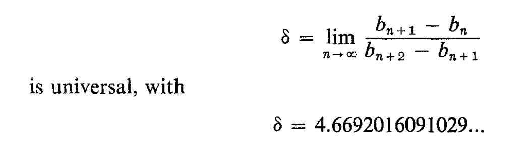 费根鲍姆的重要发现如下:出现倍周期分叉的b的那些数值,距离之比接近一个常数,这个常数大概等于4.6692……。
