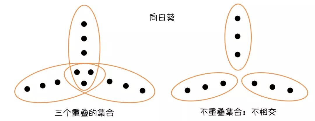 向日葵猜想与集合有关。以平面x-y上的点的集合为例,首先需要确定的是在每个集合中包含的点的固定数量,然后开始随机画环,让每个环,或者说每个集合都含有这一数量的点。环与环可以重叠,所以有的点可能会属于不止一个集合中,就像维恩图中的交点那样。