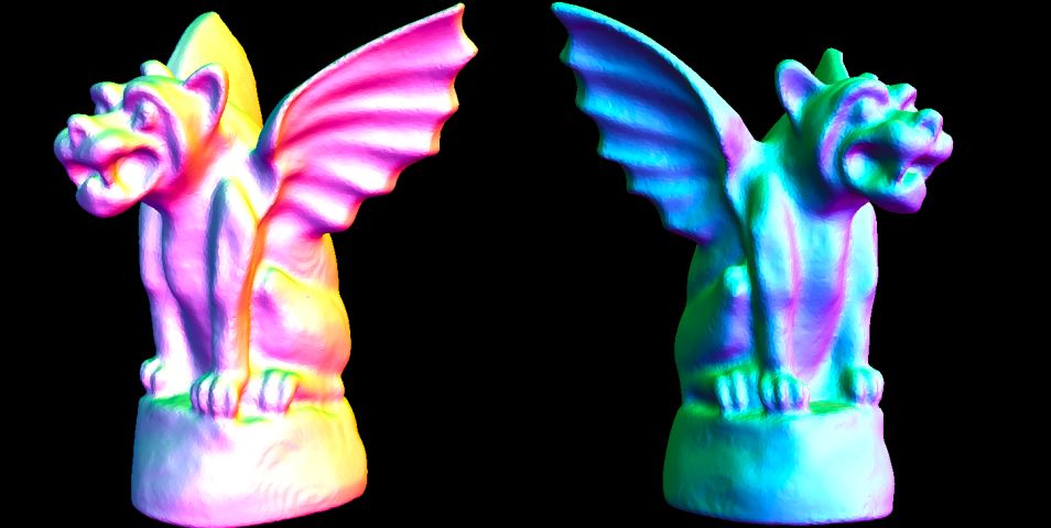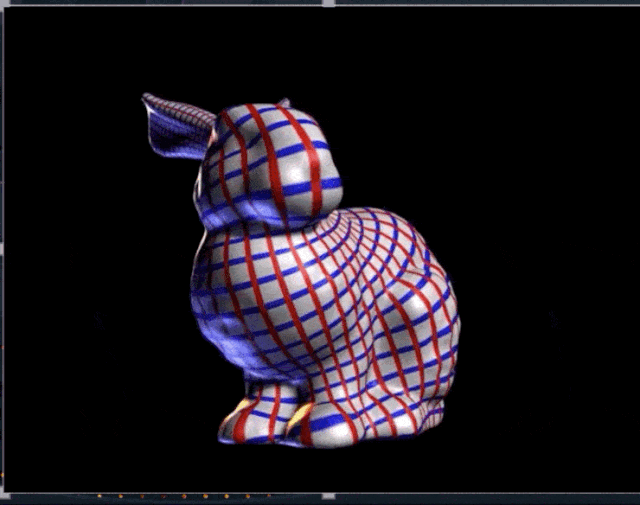 在图形学中有一个技术,叫做法向贴图。就是说我们把这个曲面摊平,摊到平面上。然后我们可以看到,每个Pixel,有3点,有3个颜色,红绿蓝。用这个红绿蓝,代表法向量的XYZ。法向贴图可以非常细腻,但是几何可以特别粗糙。这样就同时兼顾了渲染的法向量的效果,又减少了数据量,提高了整个运算速度。所以法向贴图也是整个电子游戏界,一个非常基本的技术。