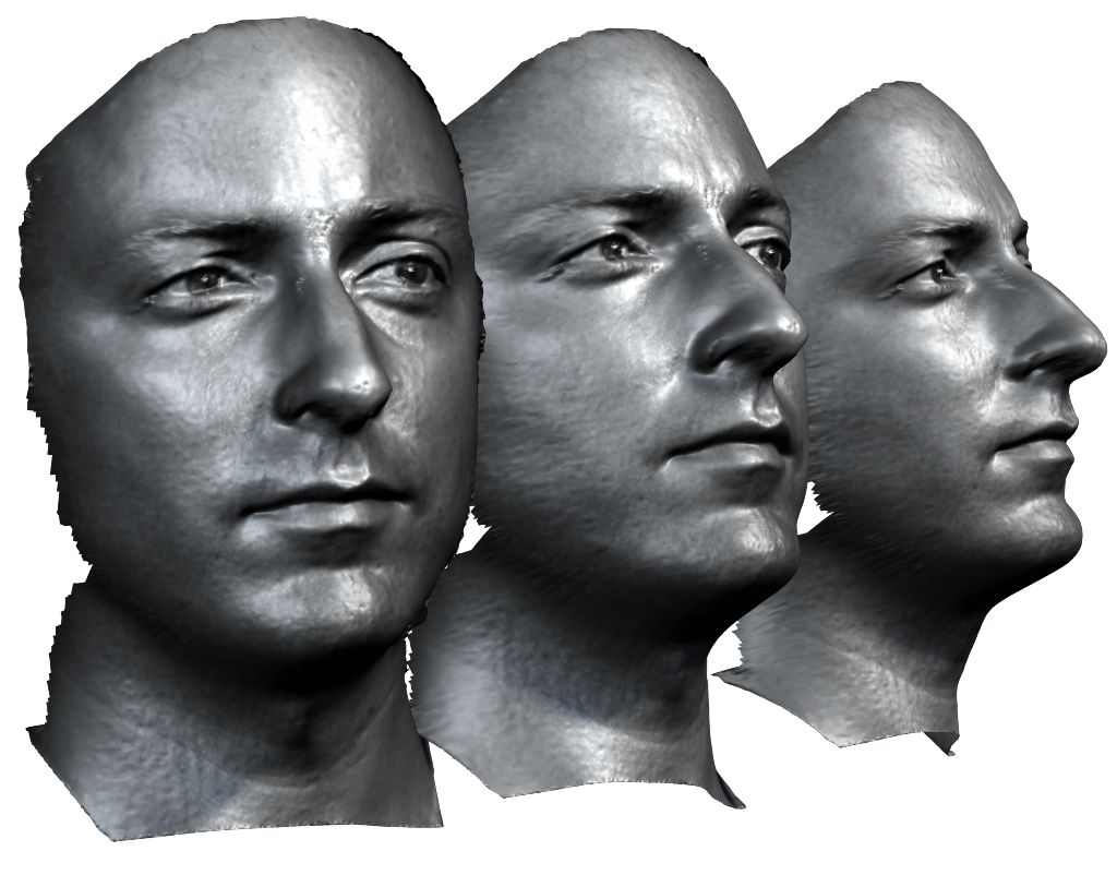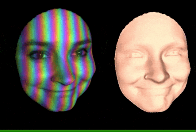 我们用三维扫描,可以得到一个人脸的模型。这里用结构光的方法进行扫描,扫描速度非常快,解析度也非常高。我们可以看到他动态的表情变化,每一帧,有差不多50万个采样点。这样可以得到非常迅速的、大规模的三维数据的采集。