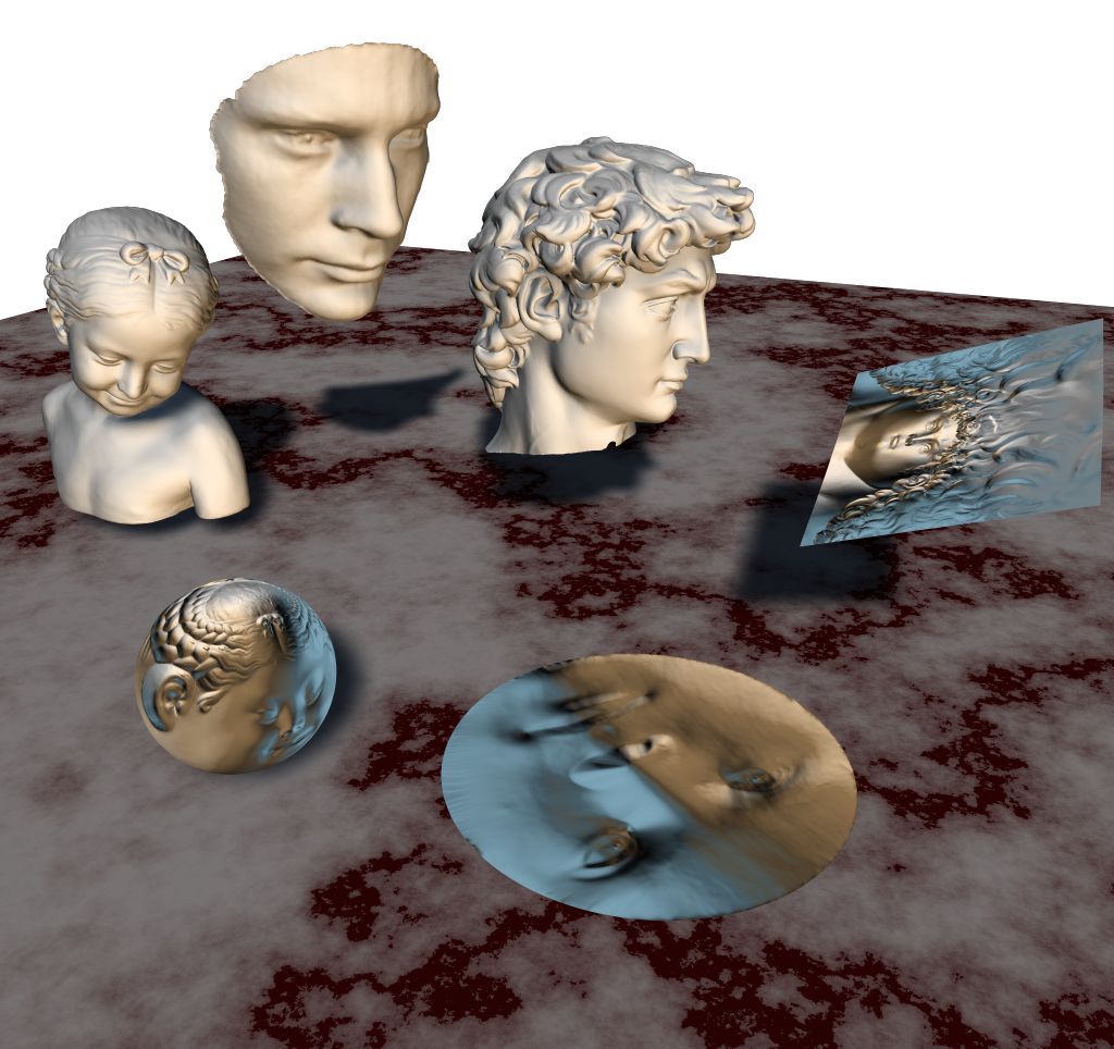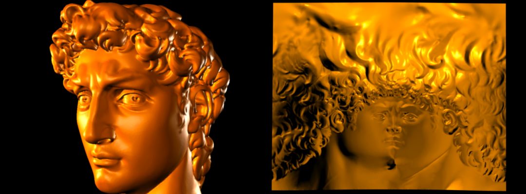 这是米开朗基罗的一个大卫头,我们将这个大卫头三维的曲面平展到二维的平面上,这样就把三维变成了二维,把弯曲的空间变成了平直的空间。