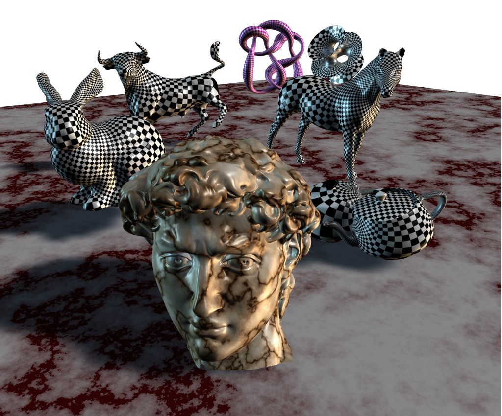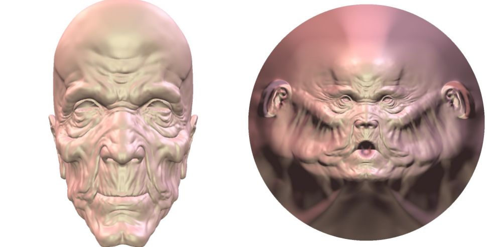 在游戏公司里,有两种艺术家。一种艺术家是做雕塑的,比如我们大家看到上图中的白模,白色的雕塑。另外一类艺术家,他们是为这个雕塑涂上颜色,画出皮肤、画出纹理、画出铠甲的。第二类艺术家只能在平面上进行作画,这就需要一个技术,就是把平面的图画贴到三维的曲面上并且使它畸变尽量地减少。比如说我们在平面上画上大理石的纹路,然后把这大理石的纹理贴到这个大卫头上,得到的就是下图这种大理石雕塑的感觉。