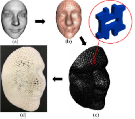 下图用红色圈出的蓝色结构,代表材料的微元。按照传统的方法,微元只能在平面上设计。我们想做一个三维的面罩的话,需要把人脸的面罩映到平面上,然后把负泊松比材料面元铺到平面区域再拉回到三维的曲面,最后通过3D打印实现出来。