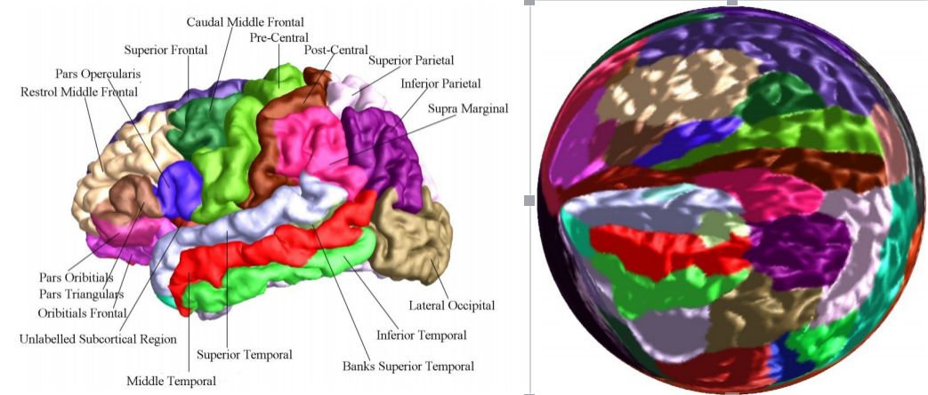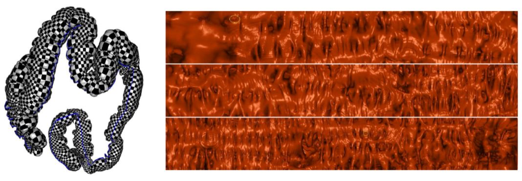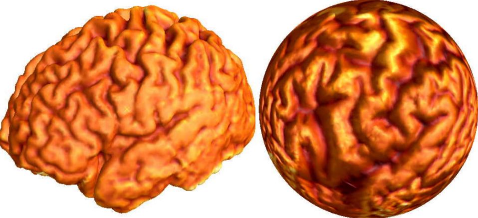 在医学图像领域,共形几何用得也非常广泛,比如说共形脑图。人的大脑,形状非常地复杂,有很多沟回,这些沟回,随着岁月的增长是会发生变化的。比较两个大脑本身来讲非常困难。通过刚才大一统定理,我们知道存在一个共形变换。把大脑映到单位球面上,并且这个映射,基本是唯一的。得到这个映射之后,我们为大脑的每一点,确定唯一的经纬坐标。这样可以在大脑上精确地定位,进行比较。