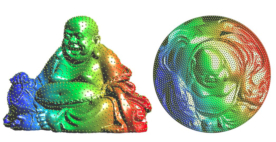 用刚才的大一统定理,我们把一个老人头映到平面的圆盘,然后再控制每个区域在平面上的大小。比如说它曲率比较高的地方,皱纹比较高的地方,让它在平面的区域变得比较大。