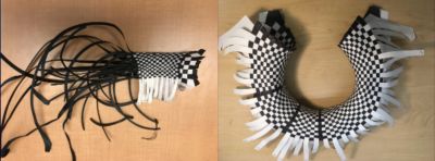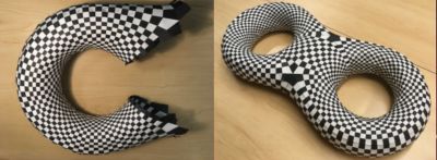 通过几何可以把复杂的曲面,分解成两组调和的叶状结构,黑色代表一组,白色代表另外一组,它们彼此编织起来可以构成任何复杂的形状。在现实生活中,只要有了计算出来的叶状结构,我们就能够用碳素纤维把它编织出来。