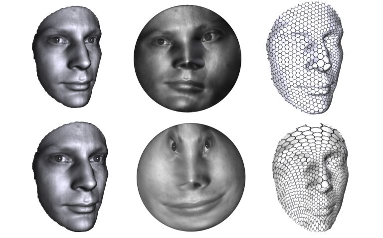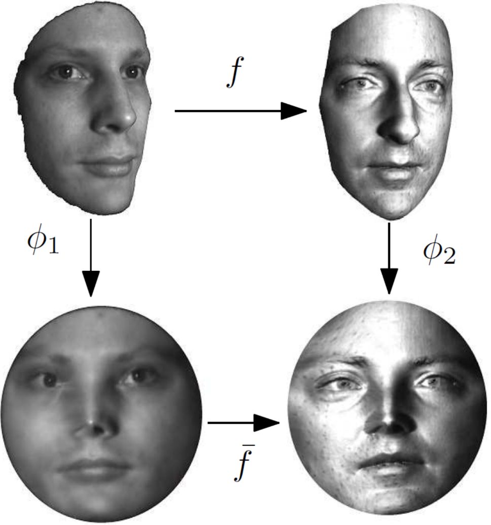 给定两张三维人脸,如何在他们之间,建立比较好的一一映射?我们的方法就是把三维人脸,用黎曼映照,映到二维的圆盘上。这样通过降维攻击,就把这三维问题变成了二维问题。二维问题,会简化非常多。