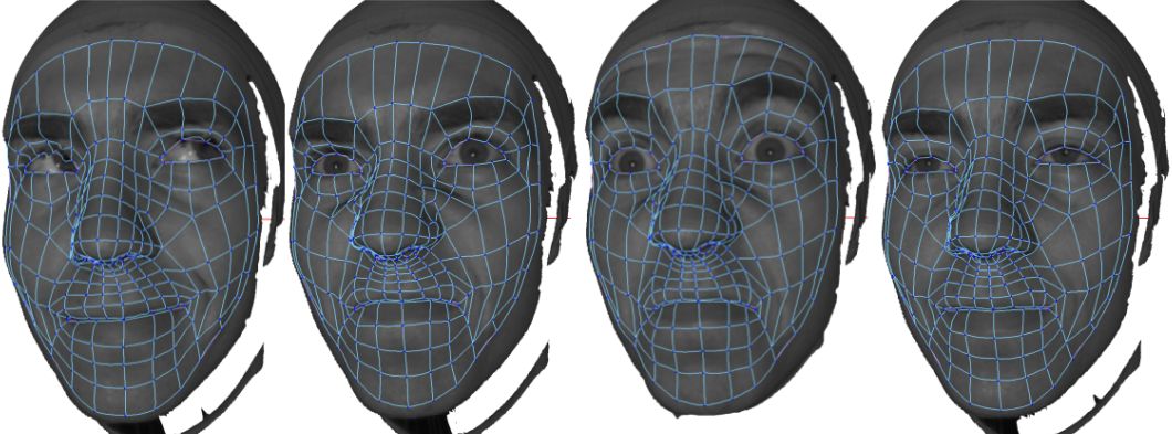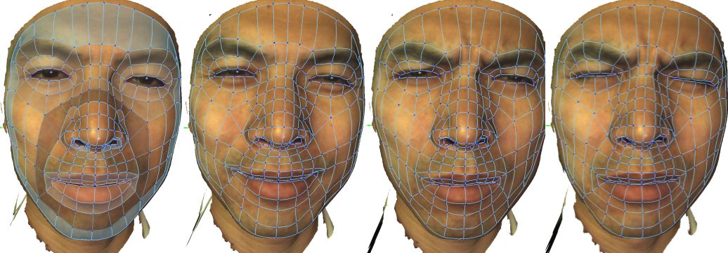 把一张蓝色的四边形网格贴到第一张脸上,那么它依随这个人脸的变化而变化。这个蓝色网格上每一个点会得到三维空间中的一条轨迹,这个轨迹就代表了这个表情的信息。我们可以把这表情信息拿出来,去移植到其他的卡通人物身上。