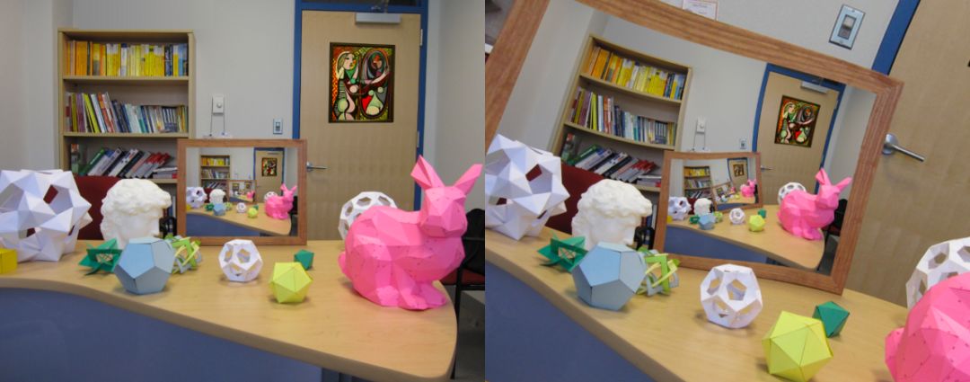 右边的图由左边照片处理而得,图片整体发生扭曲,但局部物品的形状并未发生形变(局部保持形狀,整体剧烈变化)