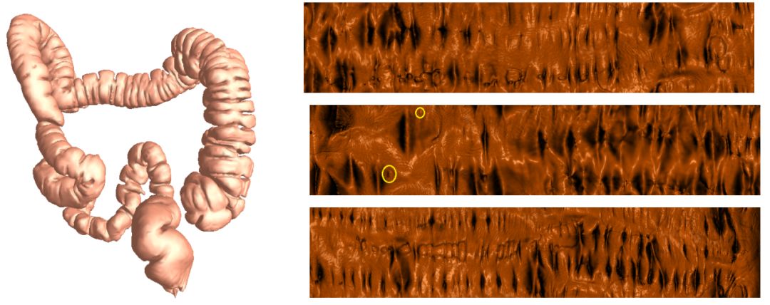 我们来看一个简单的例子。用伪彩色表达肠道内壁,那核心的话我们是要寻找一些肿瘤,或者一些比较大的息肉,那么在这个肠道中探索这个和真实的光学肠镜这个体验是非常相近的。通过这种方法我们就能看到一些比较可疑的息肉。