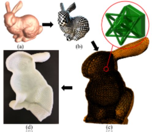 另外一个例子,如果我们想设计超轻超硬材料,想让材料尽量的轻,但是尽量的硬。怎么做呢?在自然界中,金刚石它的晶体结构是最硬的,那我们就仿照金刚石的结构,做一个微元。然后把这个微元,平铺到超轻材料的兔子内表面,那么这个兔子的整个质量还是非常轻盈,但是硬度会超过所有的材料。