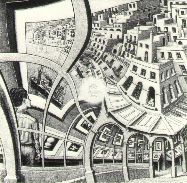 有一个特别知名的荷兰画家叫埃舍尔。他一辈子创作了大量的将数学和艺术结合的画作。这幅图画就是他的一个非常有名的画作,叫做《画廊》。