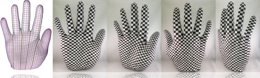 我们再看一个更复杂的模型,人手的模型,左侧的红色和蓝色代表两族叶状结构,右侧是用叶状结构得到的编织模型。真正编织出来的这个三维的形体,按照复杂曲面上的叶状结构而得。