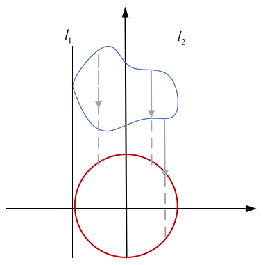 施密特( Erhard Schmidt)的投影法证明方法的独特之处在于,运用投影的方法将不规则图形与圆周相联系,具体做法是将简单闭曲线α所围成的区域夹在两平行直线之间,在两直线间作一半径为r的圆周β,以圆心为原点,y轴与直线平行建立平面直角坐标系,令 , ,这样就可以计算它们各自的面积。其中,s为曲线α的弧长参数,A为曲线α围成的面积。