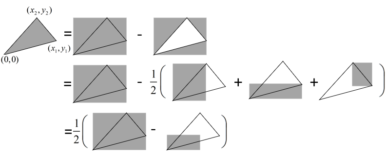 对多边形可以进行类似的推广,若将n边形置于第一象限,以逆时针方向看各顶点坐标为 (0, 0),(x1, y1), ..., (xn-1, yn-1),则该 n 边形的面积为