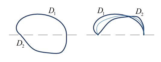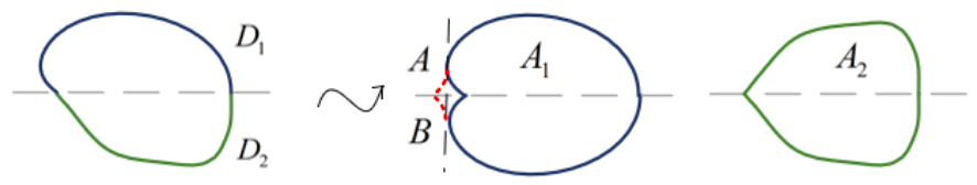 与前一种证法类似,假设曲线D所围图形面积最大,将其按周长平分为曲线D1、D2(如下图所示),不妨将曲线D2关于分割线作对称,使两段曲线处于同一侧,D1 与 D2 所围区域分别为A1、A2。接着作出它们的平均边界,此时,平均边界所围的面积可以表示为