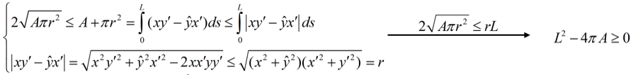 将两者面积相加,运用柯西不等式进行放缩,在计算过程中需要注意一个隐含条件,因为对原曲线作了弧长参数化处理,则有弧长参数x'2+y'2=1,计算时可进行化简,最终求得等周不等式,当等号成立时 A= πr2,L=2πr,因此原曲线围成的就是一个圆。