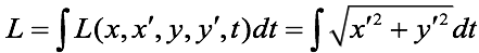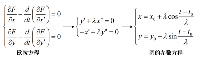 变分法的关键是欧拉方程(Euler Equation),即通过使一阶导为零求得极值点,分别化简 x 与 x’ 的欧拉方程求得最终解,这显然是圆参数方程的一种形式。