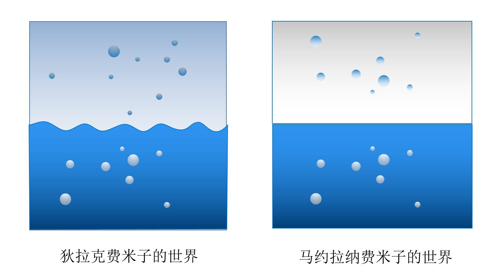 。负能量初看起来是狄拉克方程的一个“毛病”,因为它意味着一个电子可以通过跃迁到负能量的能级上而释放出任意大的能量。美妙的是费米子的泡利不相容原理正好解决了这个问题:我们可以声称在真空中,所有负能量的状态都已经被电子占据了,所以新加入的电子不得不呆在正能量状态上。这些被占据的负能量状态就像一个负能量粒子的海洋,通常被叫做费米-狄拉克海,或费米海。这就是为什么狄拉克方程只有对于费米子才是有意义的,而不能描述玻色子。这个负能海不是简单地把负能状态从理论中消除了,而是预言了一类新的正能量粒子,就是负能海中的空穴,也叫反粒子。如果把费米-狄拉克海想象成我们地球上的海洋,那么电子就像处于海平面以上的水滴(比如一场雨),而空穴就是海洋中的气泡。继续应用这个比喻,如果我们把海平面当成重力势能的零点,那么海平面以下的一滴水的重力势能就是负的。而产生一个气泡相当于在海平面下拿走了一滴水,需要克服的重力势能是正的。因此反粒子是具有正能量的粒子,比如电子的反粒子是正电子。产生一个动量为