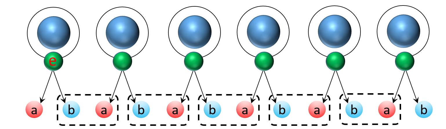 既然这样,那么说一个马约拉纳费米子具有半个自由度不就没有任何意义了吗?反正他们总是成对出现。事实并非如此。前面说的玻色凝聚体中,局部看起来玻色子(库伯对)好像可以凭空产生或者消失,只有看整个系统才会发现总的玻色子数是守恒的。跟这个逻辑非常类似,马约拉纳费米子的数目在整个系统中一定是偶数,但局部却可以出现奇数。为了实现这个单个的马约拉纳费米子,我们需要把它的波函数限制在一个局域的地方。一个最简单的实现是下图里的模型(称为Kitaev chain,或者Kitaev Majorana chain,由Alexei Kitaev在2001年提出)。考虑一个简单的体系,每个原子周围只有一个电子态能级,所有原子排成一列。每个电子能级可以被看成是两个马约拉纳零能模。粗略地讲,这两个马约拉纳零能模是能级的占据态(