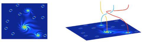 马约拉纳零能模不仅可以在一维原子链中实现,也可以存在于二维超导体的涡旋中。如果一个超导体中有很多涡旋(涡旋的数目是可以通过磁场来简单调节的),每个涡旋的中心有一个孤立的马约拉纳费米子,则每两个涡旋有两个能量为0的内部状态。值得注意的是,在量子体系中状态数目是相乘而不是相加的,所以2N个涡旋就有