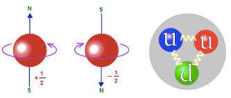 电子就是一个带有内部状态的粒子。而电子的内部状态还有一个特殊的性质:当我们把一个电子旋转一个角度后,这个内部状态还会改变。这样的内部状态像一个箭头,或者更准确地说像一个旋转的陀螺,有其旋转方向。这种类型的内部状态被称之为自旋,我们通常用一个箭头来描写它。当然还有其它类型的内部状态不受旋转的影响,这类内部状态更像不同的颜色。其实夸克,除了带有自旋型的内部状态之外,还带有这种不受旋转影响的3个内部状态,我们称其为红绿蓝(也就是说夸克总共有6个内部状态)。