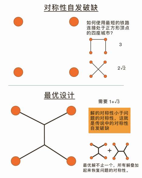 问题是对称的,解决方案不对称;自然法则是对称的,物质受法则支配的状态不对称,这就是自发对称性破缺。