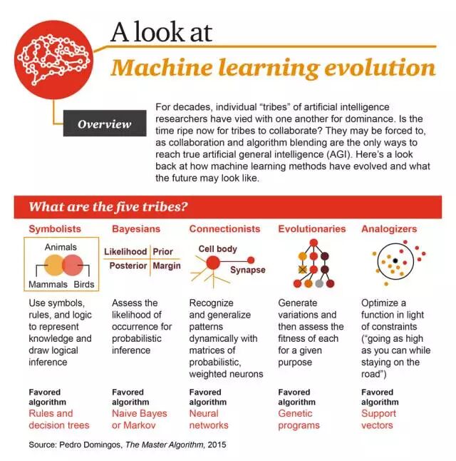 几十年来,人工智能研究者的各个「部落」一直以来都在彼此争夺主导权。现在是这些部落联合起来的时候了吗?他们也可能不得不这样做,因为合作和算法融合是实现真正通用人工智能(AGI)的唯一方式。这里给出了机器学习方法的演化之路以及未来的可能模样。
