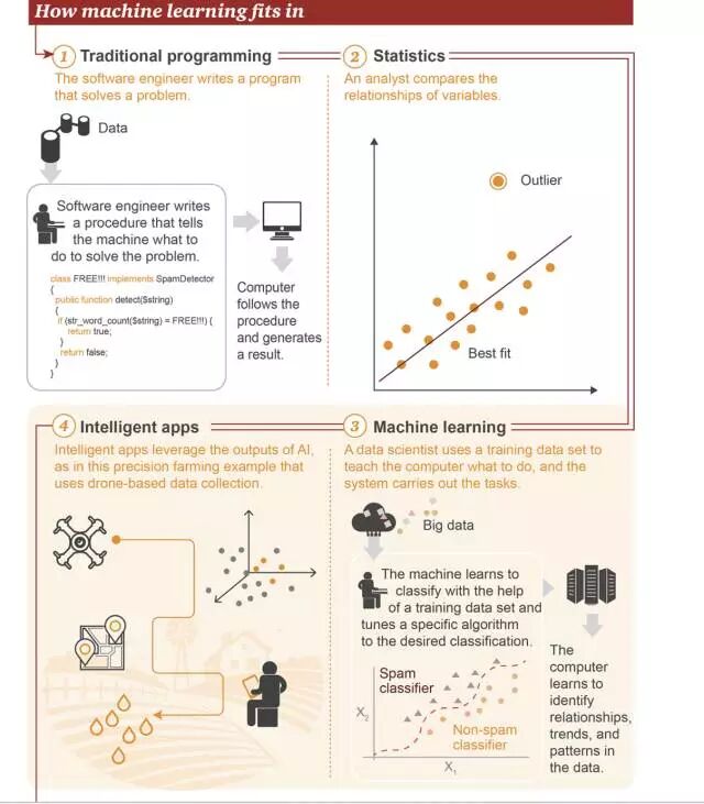 机器通过分析大量数据来进行学习。比如说,不需要通过编程来识别猫或人脸,它们可以通过使用图片来进行训练,从而归纳和识别特定的目标。