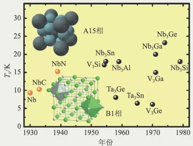还得接第十四节关于炼金术士的故事说起。1911 年,单质汞中发现超导之后,人们首先想到的就是寻找单质超导体。话说,超导单质还真不少,但临界温度高一点点的实在稀有, 常压下Tc为9 K 的铌(Nb)已然算是佼佼者。为此,科学家费了九牛二虎之力,继而在铌的化合物中寻找超导体,其中NbO的Tc 为1.4 K, NbC 的Tc 为15.3 K,NbN的Tc为16 K。适当改变元素配比,可以在NbC0.3N0.7里实现Tc=17. 8K(1954 年) ,完成这项工作的是来自美国贝尔实验室的德裔科学家马蒂亚斯(Bernd Theodor Matthias)。这些工作启迪人们,在某金属元素和非金属元素的二元化合物里,有希望寻找到更高临界温度的超导体。鉴于这些材料结构和化学式相对简单,分子量也比较轻,故而基本算是瘦子超导家族的一员。铌的碳化物和氮化物都是立方结构,和我们日常吃的食盐NaCl 结构类似,称之为B1相。同在1954年,另一个具有A15 相的超导体V3Si 被G. F. Hardy和J. K. Hulm发现(Tc=17. 1 K),它和B1 相同样具有立方结构,但面内原子分布细节不同(图2)。马蒂亚斯很快就抓住机会,在铌的A15 相Nb3Sn 中发现了Tc=18. 1 K。从第一个A15 相的化合物Cr3Si 开始顺藤摸瓜,人们陆续不断发现了诸多A15 类超导体,来自V,Ta,Nb 和Si,Ge,Ga,Al,Sn等的组合,多达60 余种。特别是Nb3Al(Tc=18.8 K),Nb3Ga(Tc=20.3 K),Nb3Si (Tc=18 K),Nb3Ge(Tc=23.2 K)等,一再突破当时的超导温度记录(图2),其中不少出自马蒂亚斯之手。目前最高临界温度的A15 相化合物是2008 年发现的高压下Cs3C60, Tc=38 K。在1986 年以前,A15 相一度统治超导临界温度冠军地位长达32 年,瘦子的实力不容小觑。