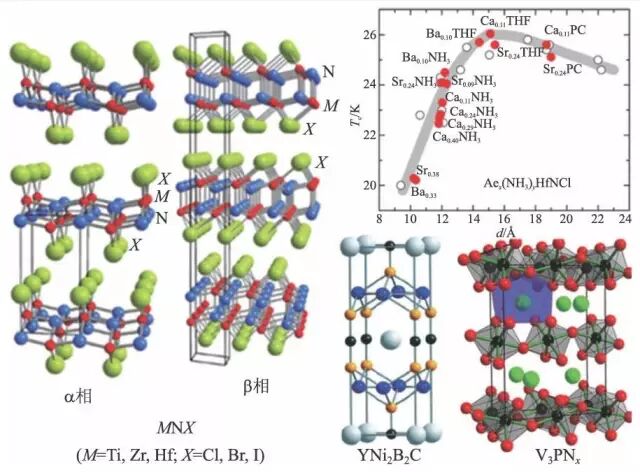 除了NbN之外,VN,ZrN,TaN等金属氮化物也都是10 K左右的超导体,这说明氮化物的超导并不是偶然的,寻找氮化物超导体,也是超导材料探索的一个可能方向。1996 年以来,一类称之为MNX(M=Ti,Zr,Hf;X=Cl,Br,I)的氮化物超导体被发现,这类层状材料需要插入离子导电层才能出现超导,具有α相和β相两种结构形式。其中日本科学家山中昭司研究组发现了α-K0.21TiNBr(Tc=17.2K),β-Li0.48(THF)0.3HfNCl(Tc=25.5 K),LixZrNCl(Tc=14 K) , β-Ca0.11(THF)yHfNCl(Tc=26 K)等。这类插层超导体和NaxCoO2,FeSe 等有着异曲同工之妙,最有趣的是,其临界温度与插层后的原子层间距直接相关(图5)。因为这类材料具有稀薄的电子浓度、不太强的电子—声子耦合和较大的超导能隙,经验上显然违背了马蒂亚斯法则,理论上也难以用BCS来解释,故和重费米子超导体及有机超导体一样属于非常规超导体,其超导微观起源目前尚有争议。这类材料也不是很稳定,或对空气敏感,目前许多实验测量尚存在诸多困难,导致人们对其了解有限。除了MNX 型氮化物超导体, 还有Ln3Ni2B2N3(Ln=La,Ce,Pr,Nd…),V3PNx,ThFeAsN等多种形式和结构的氮化物超导体,许多氮化物超导体仍待发掘,物理性质更是不甚清楚,它们是属于常规BCS 超导体,还是非常规超导体,同样需要更多实验来证实。和La3Ni2B2N3具有相似结构的YNi2B2C,LaPd2B2C 等硼化物也具有12—23 K 的超导Tc(图5),它们则属于另一个瘦子超导家族——硼化物超导体。