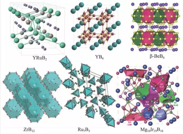 轻元素超导体里面,最庞大的家族要数硼化物超导体,至少有80 余种,包括前面提及的1 :4 :4 和1 :2 :2 :1元素配比的两大类材料。硼化物超导体大致划分如下:二元硼化物XB (X=Ta, Nb, Zr, Hf,Mo…),XB2 (X=Mg,Nd,Mo,Ta,Be, Zr, Re,Ti, Hf,V, Cr…),X2B(X=Mo, W, Ta, Re…), XB6(X=Y,La,Th,Nd,Sm,Be…),XB12(X=Sc,Y,Lu,Zr…),Ru7B3,FeB4; 三元硼化物ReXB2(Re=Y,Lu,Sc;X=Ru,Os),ReB2C2(Re=Y,Lu), Ae0.67Pt3B2(Ae=Ca, Sr, Ba),ReX3B2(Re=La, Lu, Th; X=Rh,Ir,Os,Ru),ReX4B4(Re=Y,Nd,Sm,Er,Tm,Lu,Th,Sc,Ho…;X=Rh, Ir, Ru), Mg10Ir19B16, Li2X3B(X=Pt, Pd); 四元硼化物ReX2B2C(Re=Y,La,Pr,Th,Dy,Ho,Er,Sc,Tm,Lu;X=Ni, Pt…) 。这些硼化物超导体的结构多种多样,元素配比和搭配变化多端,要找到它们的共性实在是个极具挑战的事情(图7)。
