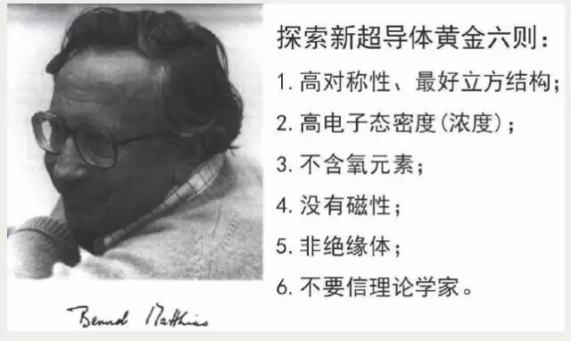 马蒂亚斯因为A15 相的研究,加上其他一系列新超导材料的发现,成为了当时超导材料探索的超级大师。身为超导界的老司机,他也是自信满满做领路人,早早地提出了“ 高温超导”的概念,只相对10 K左右的单质超导而言。马蒂亚斯总结了探索更高Tc超导材料的黄金六法则( 实际上不止6 条,此处姑且如此总结):高对称性、高电子态密度、不含氧、无磁性、非绝缘体、不信理论家(图3)。这些经验是A15 相化合物探索的精髓, 例如往往只有3:1 的化学计量比才能具有最好的Tc,在Nb3Ge 中无论掺杂、加压、热处理等, 都只会导致晶体缺陷降低临界温度。在马蒂亚斯法则指导下, 人们试图在三元化合物中寻找超导电性,例如ReRh4B4(Re=Y,Nd, Sm, Er, Tm,Lu, Th, Sc…) ,TiRuP,HfOsP 等,不幸的是, 这些化合物连突破20 K 的Tc都很困难,令人不禁怀疑自己遵循了“ 假法则”。直到1986 年, 铜氧化物高温超导体的发现,几乎(注意,不是全部!)颠覆了马蒂亚斯法则,至少6 条里面5 条是错的,仅剩下“远离理论学家”也许是对的。不过,马蒂亚斯也没有完全错,他很早提出了d 电子的重要性,并早就猜测磷化物、砷化物、硒化物、硫化物的超导电性,时隔多年后才被一一证实。这是后话,我们此节暂不细说。在此之前,马蒂亚斯依然是超导材料大师,为了纪念他的贡献,超导领域最高级别的国际超导材料和机理大会(M2S会议)设立了3个奖项:昂尼斯奖、巴丁奖、马蒂亚斯奖,分别颁发给超导实验、理论和材料方面突出贡献的科学家。