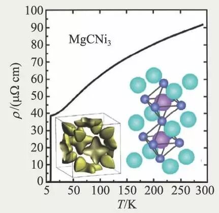 关于含Ni 和C的超导体,有一个小插曲就是2001 年美国R. J. Cava研究组发现的MgCNi3超导体。该化合物具有八面体钙钛矿结构,但不是氧化物,Tc 约为7 K(图6)。由于Ni 是磁性元素,人们首先怀疑它是否具有磁有序或者磁涨落,并再度怀疑它可能属于非常规超导体。随着数年的实验研究,最后两个疑点都被澄清,确认它是属于电子—声子耦合的常规BCS超导体,和复杂的钙钛矿氧化物有着天壤之别。