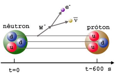 △ 自由中子的半衰期大约是611秒,衰变成质子、电子和反中微子。(图片来源:Scienceblogs.com)