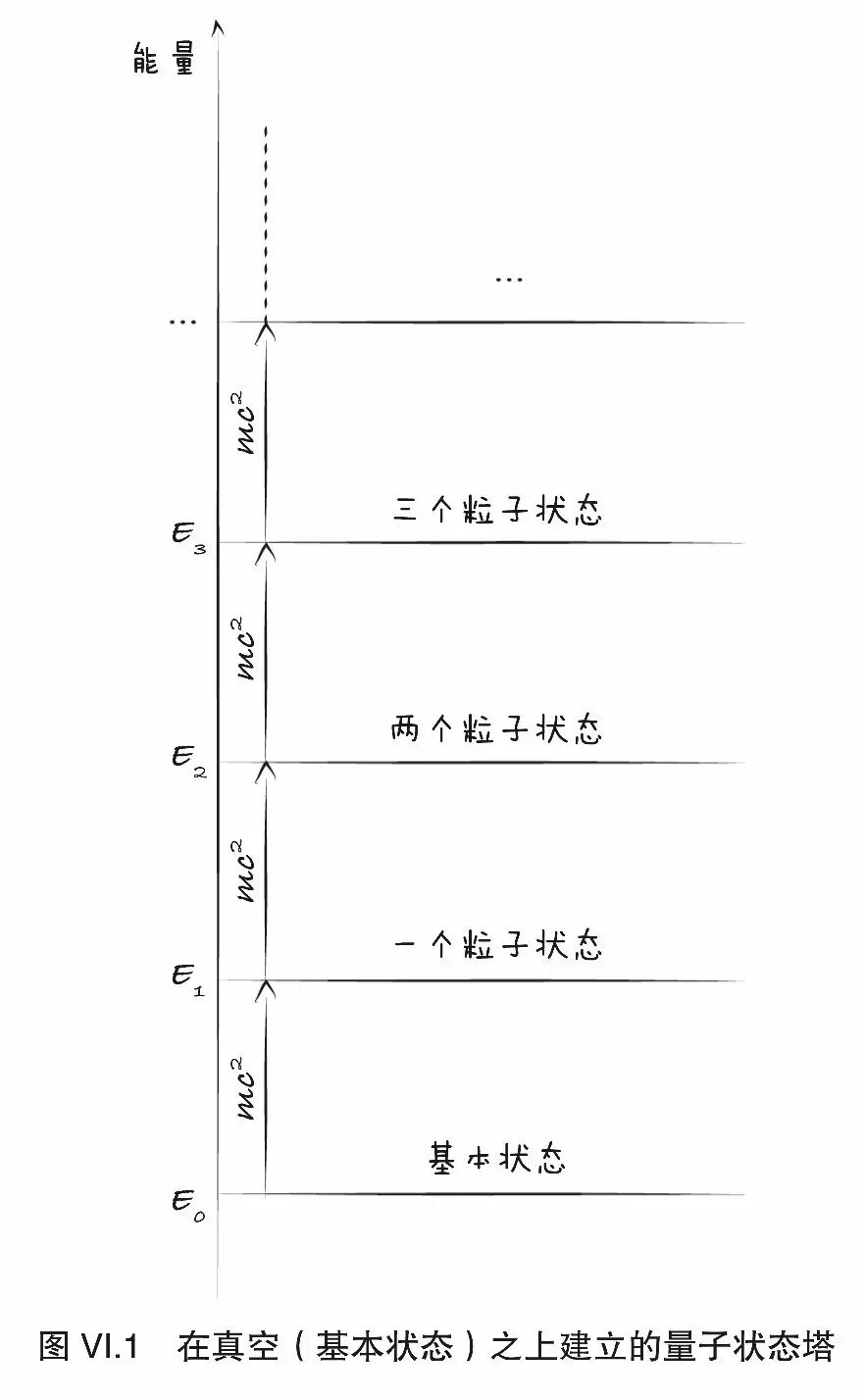 对于西方读者来说,“真空”一词给概念理解造成了困难:既然真空是清除一切之后剩余的东西,物理学家又如何在其中看到了结构、对称、涨落、能量……甚至还能让一个真空向另一个真空演变?正因如此,量子物理学家更倾向于使用“基本状态”的概念:在一个最小的能量状态之上建立起一整套状态,以此描述整个量子体系;这个最小的能量状态被称为“基本状态”。一个粒子状态建立在基本状态之上,粒子的能量相当于基本状态的能量再加上粒子的质量能量(mc2);以此类推,接下来是两个粒子状态、三个粒子状态……最终在基本状态之上建立起一个“状态塔”(图VI.1)。