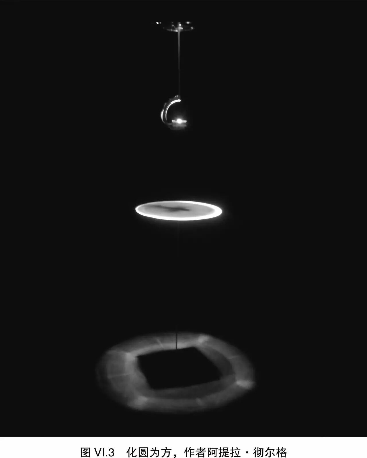 第三个图景在我们的实验室里:阿提拉·彻尔格的作品“化圆为方”(Squaring the Circle)藏在黑色屏幕里(图VI.3);四叶草状的镜子反射出光芒,投射出圆形碟片的方形阴影。圆圈是宇宙本身,而这个作品反映出,圆圈本身有着变成方形的潜在可能——圆圈如同虚拟的方形。在这个作品中,量子真空是什么?在我看来,是光。因为在这里,光是展示变化潜能的介质。