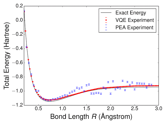 通过使用 VQE,研究人员对氢气分子H2 的能量全景图(energy landscape)进行了量子计算。他们将 VQE 的表现与另一种用于传统化学量子算法——相位估值算法(PEA)进行比较。使用 VQE 实验计算出的能量值表示为 H - H 键长度的函数,如下图所示。