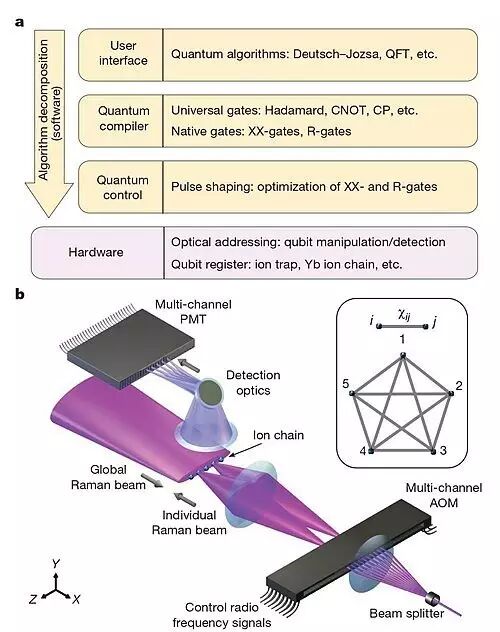 2016年 8 月 4日出版的《自然》封面论文,介绍了美国马里兰大学量子信息和计算机科学联合研究所(JQI)的一款可编程小型量子计算机。这也是首个可编程、可以在软件调整设置的量子计算机。 计算体系结构:a. 软件到硬件操作层级;b. 硬件配置