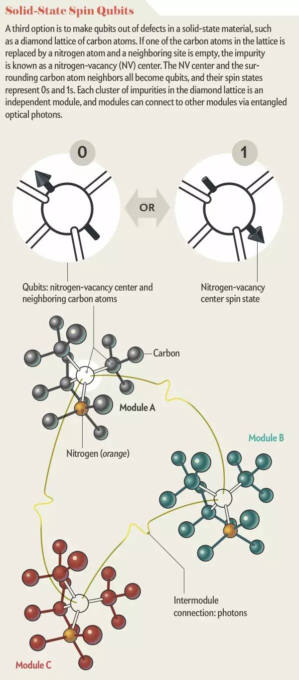第三种方法是用固体中电子自旋作为量子比特(下图)。这种量子计算机模块的一个优点是可以在室温下工作。
