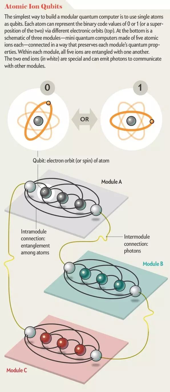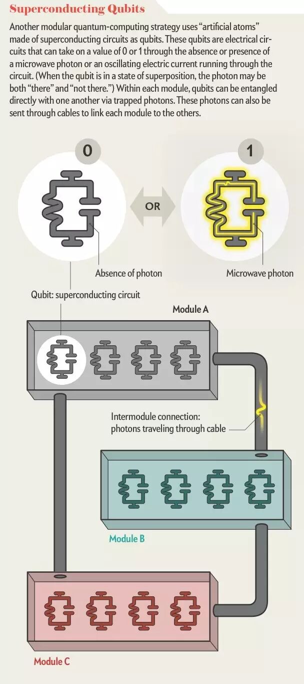 这就保证了每个模块的独立性,每个模块是一只小型的量子计算机。但这些模块又是有机结合在一起的,构成了一个有许多位量子比特的可以有实用价值的大型量子计算机。