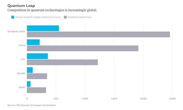 量子计算的研究增长:蓝色表示年度研发经费(单位为百万欧元),灰色为发表的研究成果