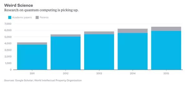 量子计算的研究增长:蓝色为论文数量,灰色为专利数量