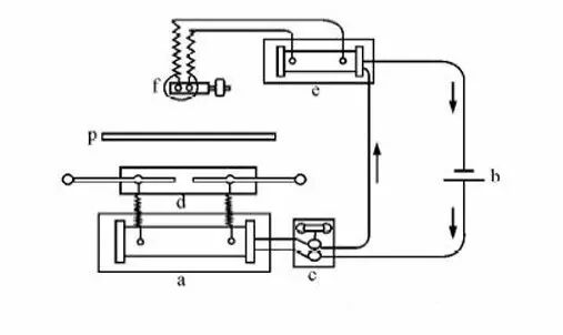 赫兹实验的电路图(图片来自网络)(a、e为感应圈,b为电池,感应圈a与电极d相连,感应圈e与电极f相连, c为水银开关,p为隔板)